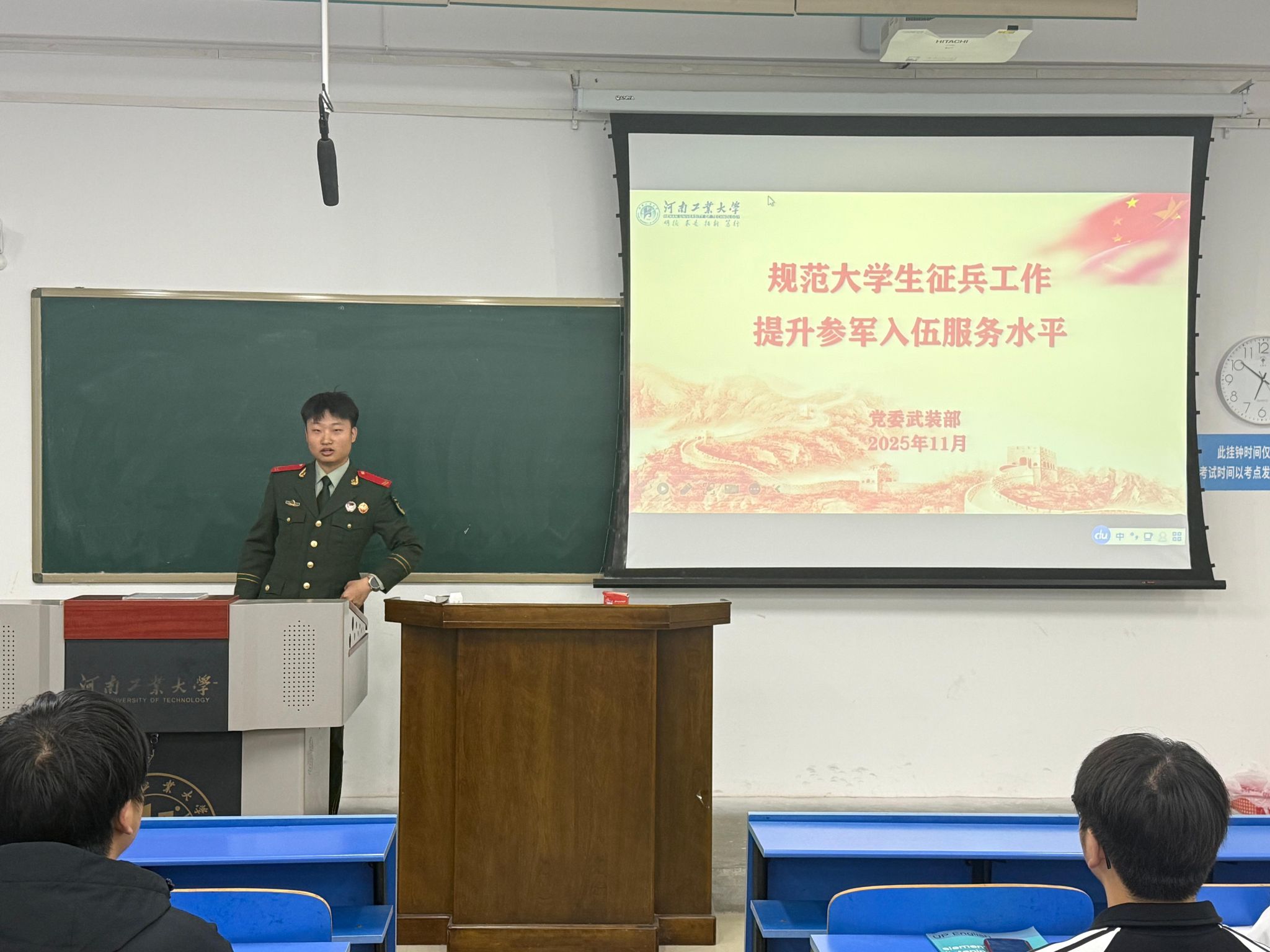 为积极响应国家征兵号召,鼓励青年学子投身国防事业,11月24日晚,91社区 在4号楼106教室成功举办秋季学期征兵宣讲会。91社区 全体辅导员、各年级学生代表参加此次宣讲会。会议由2024级辅导员赵洁主持。