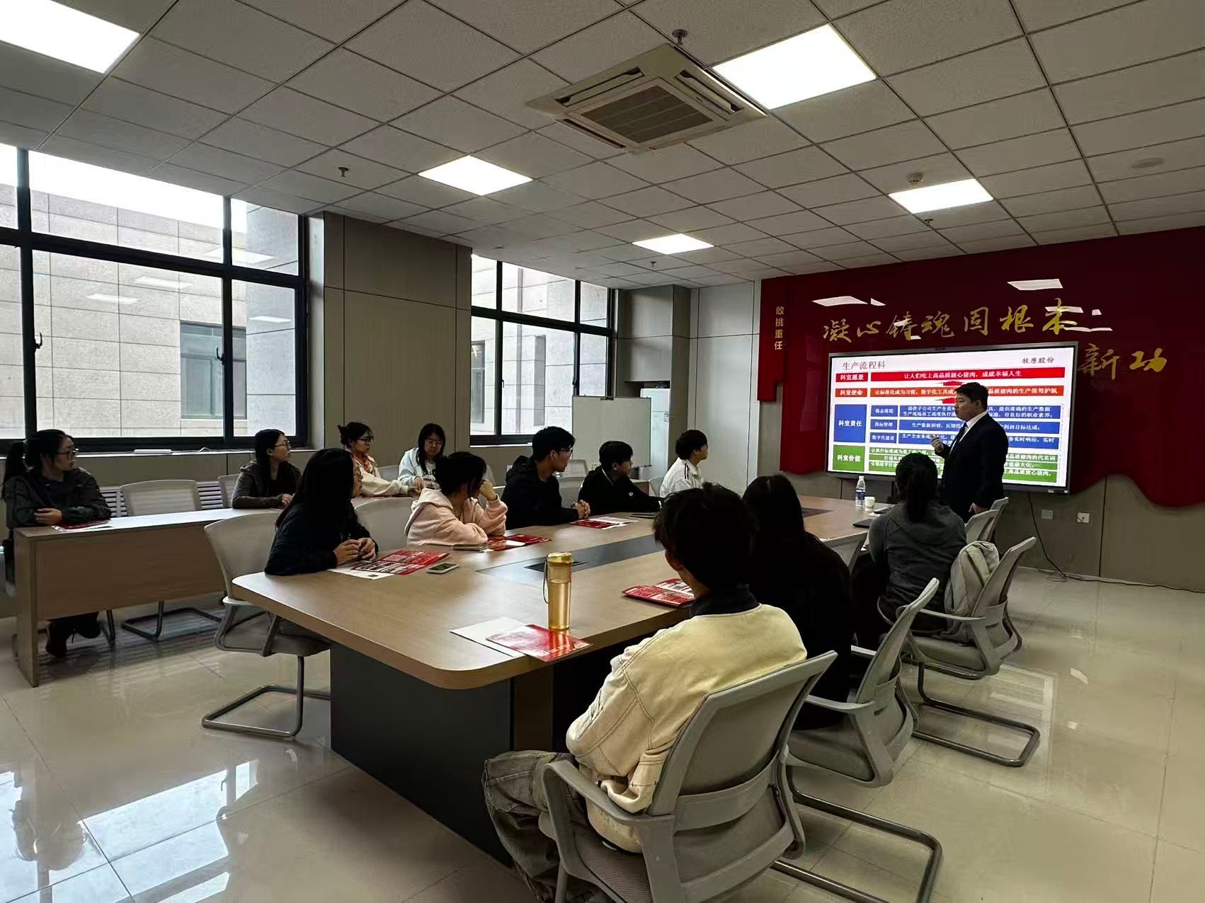 通过前期的精准筛选,组织20余名专业匹配度高的优秀毕业生参与,确保人岗相适最大化。牧原集团人力资源负责人系统介绍了企业从传统养殖到智能农牧的转型升级历程,重点展示了大数据技术在饲料配方优化、疫病预测模型等核心业务场景的应用成果。针对学生关注的数据分析师、统计建模师等岗位,企业代表从任职要求、晋升通道到实战项目培养机制均作了细致解读。
