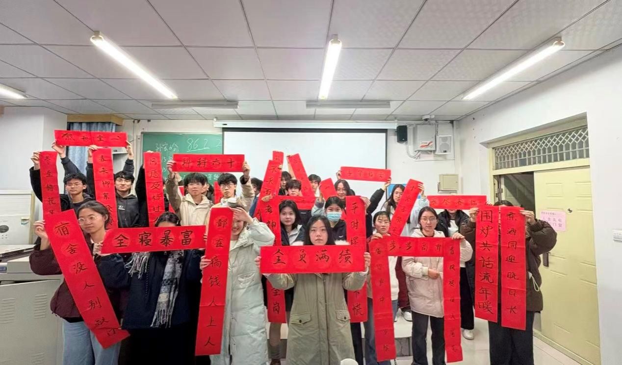 2025级应用统计三班的教室里则洋溢着淡淡的墨香,在班主任王利博的组织下,同学们开展了写春联的活动。王利博为同学们准备了红纸、毛笔和墨水等材料。同学们书写的内容既有传统吉祥诗句,也有结合专业特色的创意对联。王利博表示:“写春联不仅是一门艺术,更是传统文化的传承。希望通过这样的活动,让同学们在快节奏的学习生活中,感受传统文化的魅力。”